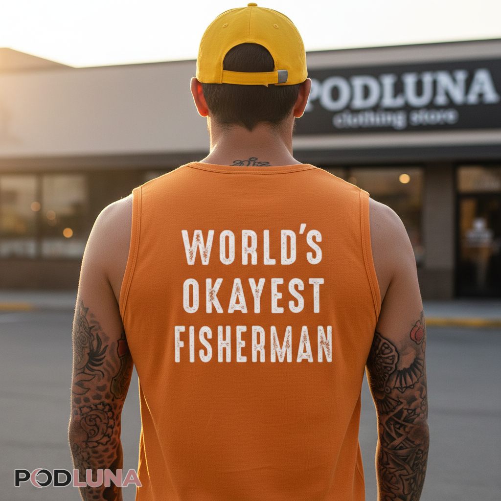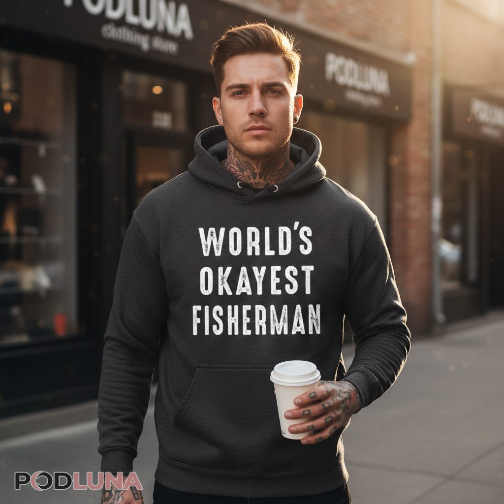 A self-deprecating declaration appears on this t-shirt celebrating fishermen who acknowledge they’re not trophy winners but still love the sport. The design features three lines of text stacked vertically in bold white uppercase letters with distressed vintage texture. “WORLD’S” sits at the top, followed by “OKAYEST” in the middle, and “FISHERMAN” anchoring the bottom. The simple typography delivers maximum impact through honest humor. The word “okayest” creates the joke—a playful admission that while this angler may not be the best, greatest, or most skilled fisherman, they’re solidly okay at it and that’s perfectly acceptable. The message resonates with fishermen who catch some fish but not always the biggest, who enjoy the sport without obsessing over technique, and who fish for relaxation rather than competition.