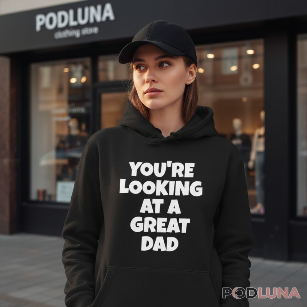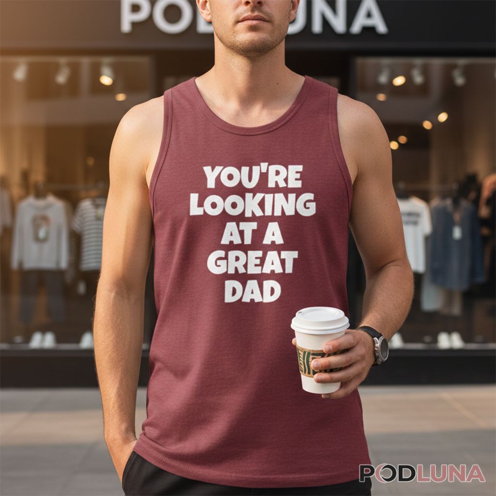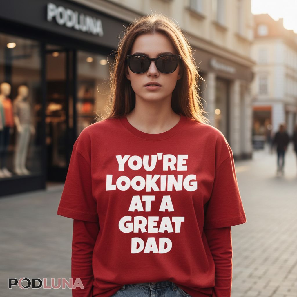 A confident declaration of fatherhood excellence appears on this t-shirt making a bold statement with simple, direct messaging. The design features five lines of text stacked vertically in bold white uppercase letters. “YOU’RE” sits at the top, followed by “LOOKING,” then “AT A,” “GREAT,” and finally “DAD” at the bottom. The straightforward typography creates a direct communication with anyone reading the shirt, essentially pointing at the wearer and declaring his greatness as a father. The bold block letters ensure readability from a distance while the simple message requires no explanation or context—just pure dad confidence delivered through clean design. The vertical stacking creates visual flow that draws the eye from top to bottom, building to the punchline that yes, this person wearing the shirt is indeed a great dad and isn’t shy about saying so.
